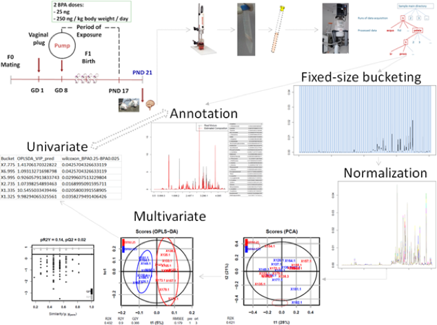 | Study: Metabolic shifts induced in vivo after perinatal exposure to low doses of BPA in CD-1 mice were assessed. In this study conducted by the ToxAlim-MeX team and the Tufts University school of medicine (Boston, MA, USA) in collaboration with the AXIOM-MetaToul-MetaboHUB platform, aqueous brain extracts from twenty-four 21-day-old pups whose mothers were exposed to either 0.025µg or 0.25µg BPA/kg BW/day during gestation and lactation were analyzed by NMR Spectroscopy. | ![]() |