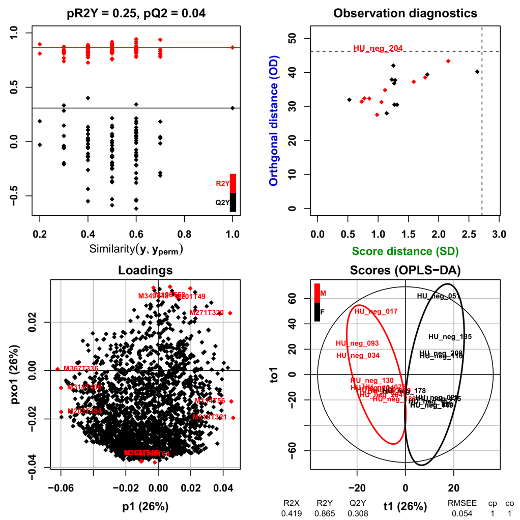 Figure 6: Example output graphics for OPLS-DA models. The "gender" factor has been modelled by using the example dataset on W4M. Top left: Permutation testing to assess the significance of the R2Y and Q2Y values. Top right: Diagnostic plot to highlight observations which would be far from the projection plane or, within this plane, far from the center. Bottom left: Loading plot. Variables with the most extreme values along each axis are in red. Bottom right: Score plot for the first predictive and the first orthogonal component. Ellipses corresponding to 95% of multivariate normal distribution for each gender are indicated in colors.